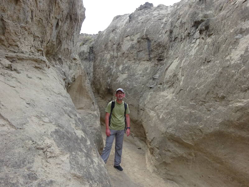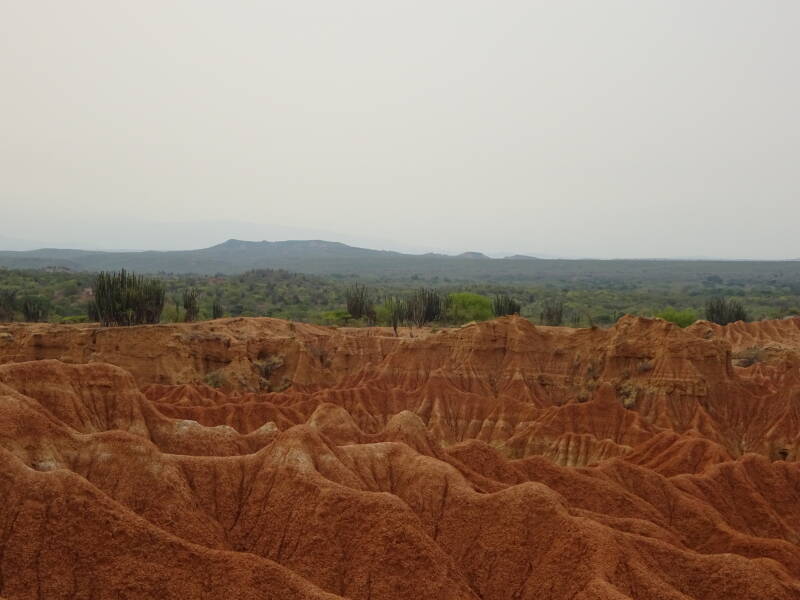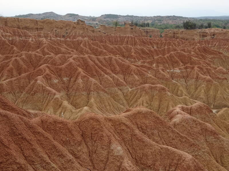 Wij staan in deze woestijn. Een woestijn die ooit een binnenzee is geweest. Miljoenen jaren terug. Doorheen die vele jaren hebben de Rio Magdalena en zijn zijrivieren zandsteen, grind en klei aangevoerd. Fossielen van reptielen en zoogdieren wijzen op een warm klimaat en veel vegetatie. Die fossielen leveren het bewijs van andere tijden. Van vochtige tijden. Zij zijn de historische barometer. Tijden veranderen, dat wordt wel eens gezegd. Hier kunnen we vaststellen dat die uitdrukking in zich een kern van waarheid draagt. Het is droger geworden. Zon, regen en wind hebben een bizar landschap gecreëerd. Ik kijk om mij heen naar de door erosie gevormde ‘sculpturen’ en moet denken aan de schubvormige huid van reptielen. Het lijkt alsof Godzilla hier ligt te slapen. Alsof hij hier zijn dutje doet. Klaar om wakker te worden, op te staan en iedereen van zich af te schudden. Die gedachte maant mij aan tot voorzichtigheid. Niet met de voeten stampen. Zachtjes aan. Wie slaapt mag niet wakker gemaakt worden. Slapende honden, u weet het wel.
