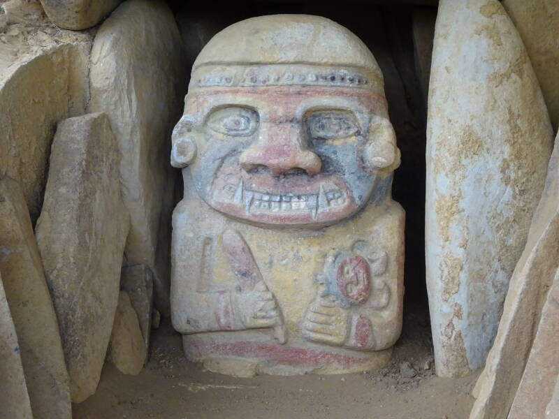 Vandaag is het onze laatste dag in San Agustin. Twee dingen hadden we nog graag gezien. Om op die plaatsen te raken, hebben we een 4x4 nodig. De wegen zijn hobbelig. De wegen zijn smal. De wegen zijn steil. Op die momenten kan een 4x4 best wel handig zijn. Al schuddend en rammelend komen wij aan bij de eerste halte. La Pelota. Nog maar eens een grafheuvel. De derde site op rij die wij bezoeken. Maar alweer hebben we zo onze redenen om tot hier te komen. Deze site staat gekend om zijn bijna intacte beelden. Gave beelden met sporen van gekleurde gezichten. Die kleuren maken ook dat de uitdrukkingen net iets feller zijn. Die gekleurde gezichten maken deze plek toch wel bijzonder. Die gekleurde gezichten verantwoorden een bezoekje.